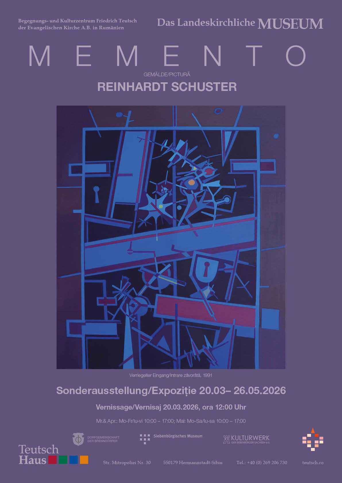 Vom 20. März bis 26. Mai 2026 wird im Begegnungs- und Kulturzentrum „Friedrich Teutsch“ in Hermannstadt die Ausstellung „Memento“ mit Werken des aus Siebenbürgen stammenden Künstlers Reinhardt Schuster präsentiert. Entstanden in den letzten vier Jahrzehnten, erinnern die Bilder an verschiedene Ereignisse, die in diesem Zeitraum stattfanden. In einem ihm eigenen Stil „wollen Reinhardt Schusters Leinwände als Zustandserscheinungen von Welt und Leben, gefiltert durch das Wesen des Malers sein“ (Dr. Irmgard Sedler).