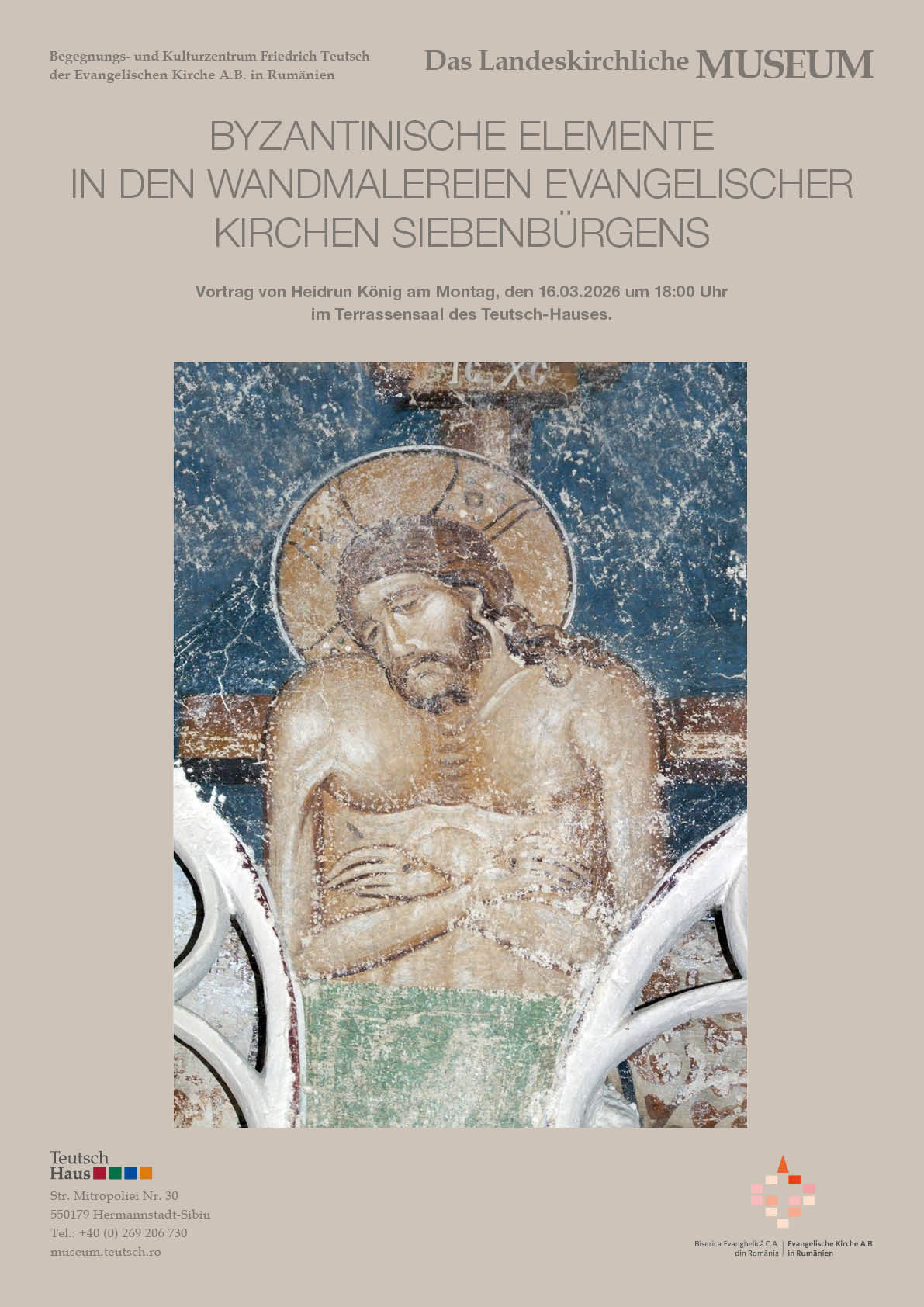 Hermannstadt. Einen kunsthistorischen Vortrag zum Thema „Byzantinische Elemente in den Wandmalereien evangelischer Kirchen Siebenbürgens” bietet Museumsleiterin Heidrun König am Montag, dem 16. März 2026, um 18 Uhr, im Terrassensaal des Teutsch-Hauses.